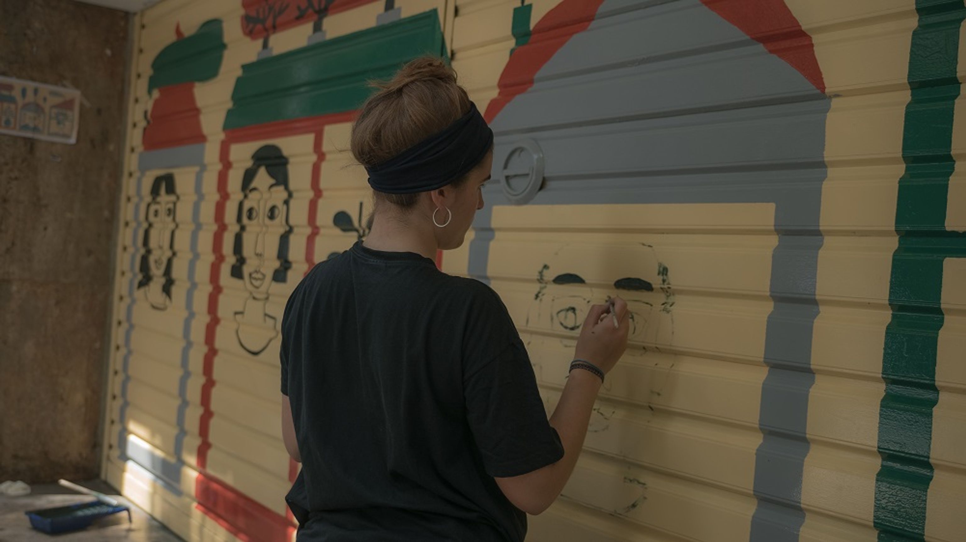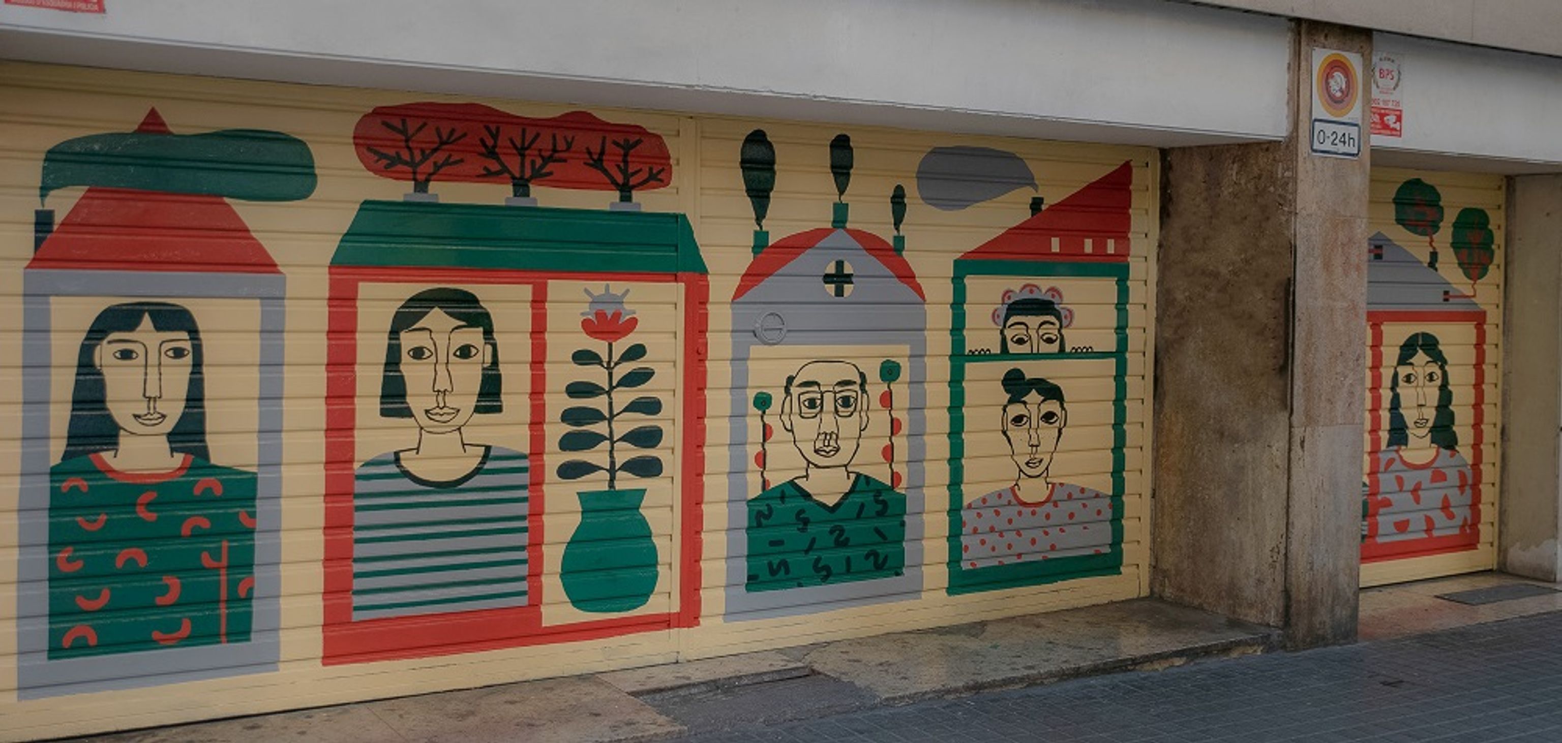 En l'obra els protagonistes són uns personatges, bastant presents en la meva obra en general. He volgut expressar el concepte de comunitat, de veïnat, de família. També he volgut pintar una cosa fàcil de “llegir” i que atrapi al passejant, ja que és una imatge que es mira uns segons mentre es camina pel carrer. Tampoc pertocava per a una il·lustració súper complicada, el relleu de les persianes no el posa fàcil. Així que vaig acabar donant-li aquest aspecte més geomètric, més senzill, però animat gràcies a la combinació dels colors i al caràcter dels personatges.