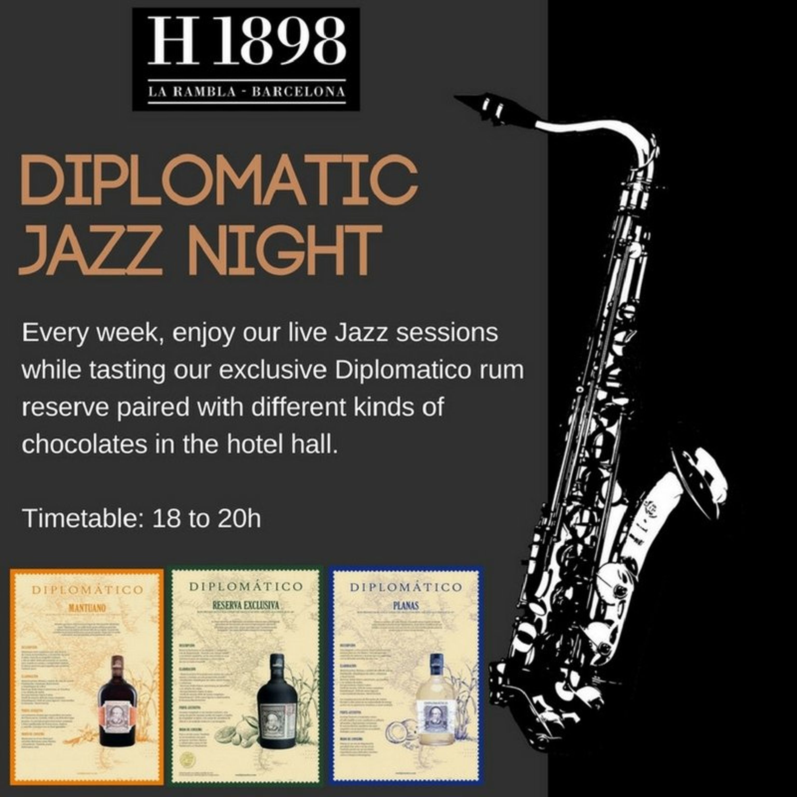 Ese sería el caso del Hotel 1898 con las Diplomatic Jazz Night. Todos los jueves, de 18h a 20h, los clientes del hotel ponen a prueba sus sentidos en una sesión de jazz en directo y de la exquisita degustación de rones Diplomático maridados con chocolates que se ofrece a manos de expertos. Mientras la melodía de la banda va sonando y la cálida voz de envuelve y ameniza el ambiente, dos expertos explican con detalle las características de cada ron así como el chocolate adecuado para cada uno de ellos. Una vez el huésped ha descubierto el suyo, puede saborearlo en el cóctel especial de la carta.