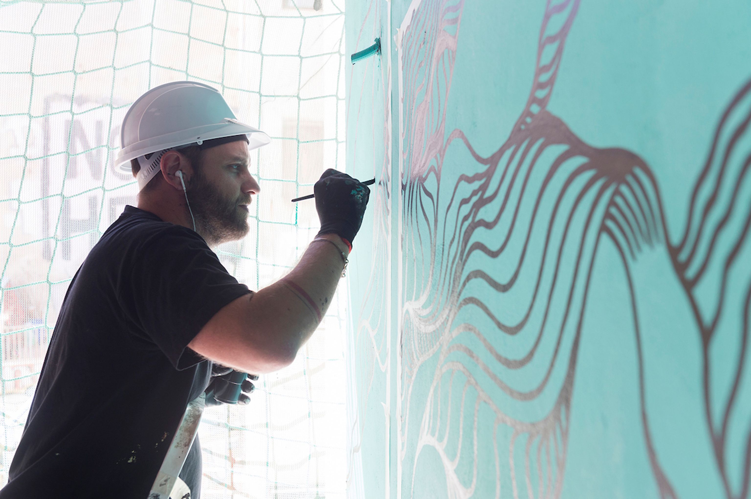 El ilustrador Joan Tarragó es el responsable de los súper murales que se exponen en las diferentes plantas del hotel, de los motivos texturizados que visten los cristales de la fachada, de las puertas de neón que abren habitaciones imaginarias, de un súper ojo luminoso y del mural que encontramos en el techo del lounge-bar. Su obra recoge una mirada histórica y aporta una visión contemporánea para crear algo específico y único: “En mi proceso creativo, normalmente, me intento basar en la historia del lugar, conocer las raíces, los orígenes y después trasladarlo todo a una visión mucho más moderna. En este caso se trataba del antiguo Rec Comtal que alimentaba gran parte de Barcelona: esa estructura hidráulica de primera magnitud, es agua, en definitiva es vida, ya que se trataba de una canalización de agua que permitía cultivar y que por tanto, era la fuente de alimento de la época. Quería plasmar todo eso en mi obra“. Y añade:“También quería dejar constancia de la localización de los restos históricos. De hecho, el mural del patio de la entrada, al que he llamado individuo, es precisamente mi interpretación de uno de los tres personajes arqueológicos hallado durante la construcción del hotel. El contenido del mural es un río horizontal que contiene camuflado en él partes de un esqueleto. Se trata de un homenaje a la memoria histórica y a la vida alrededor del Rec Comtal. En esa parte del proyecto era irresistible no utilizar ese contenido histórico”.
