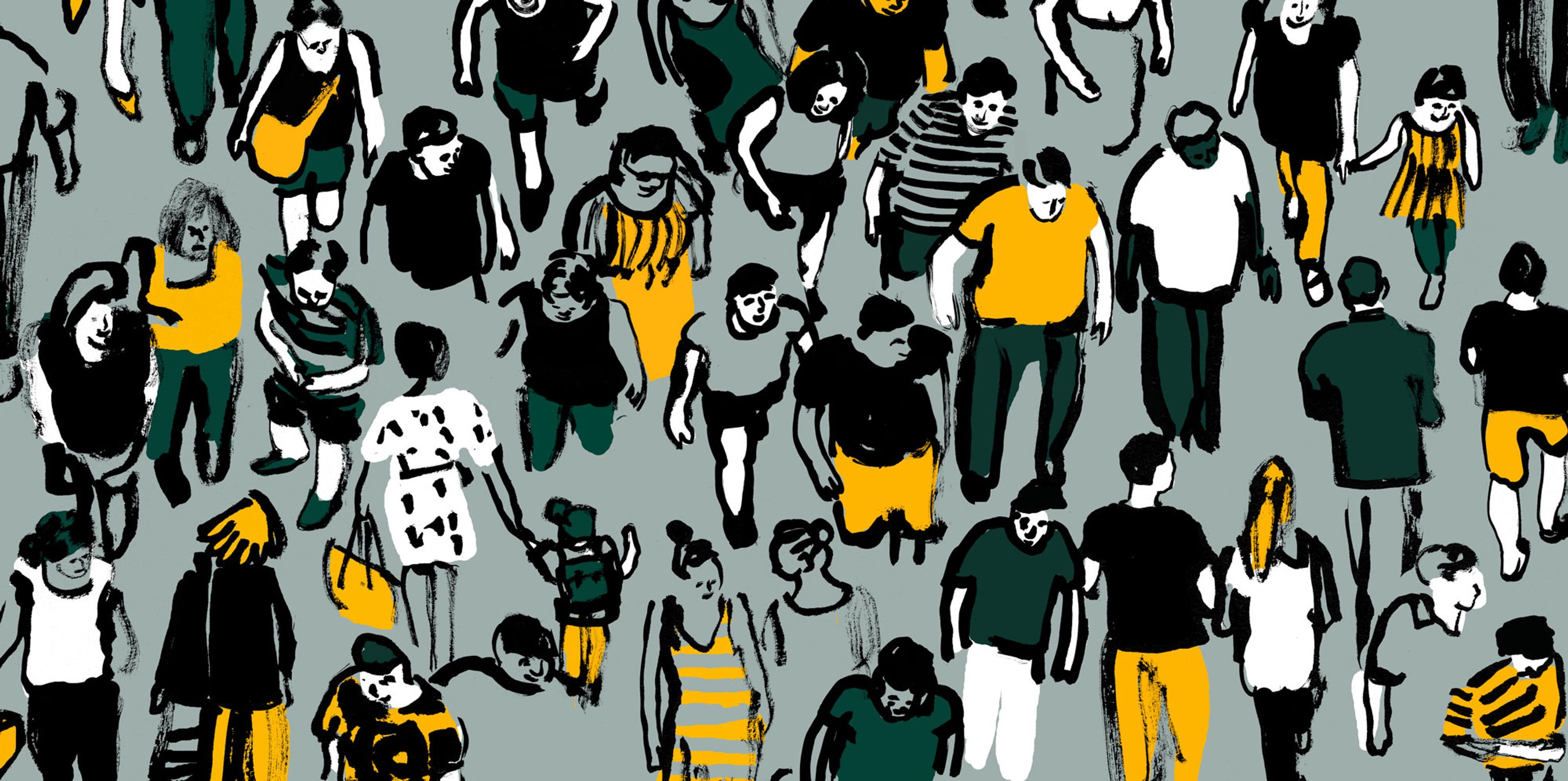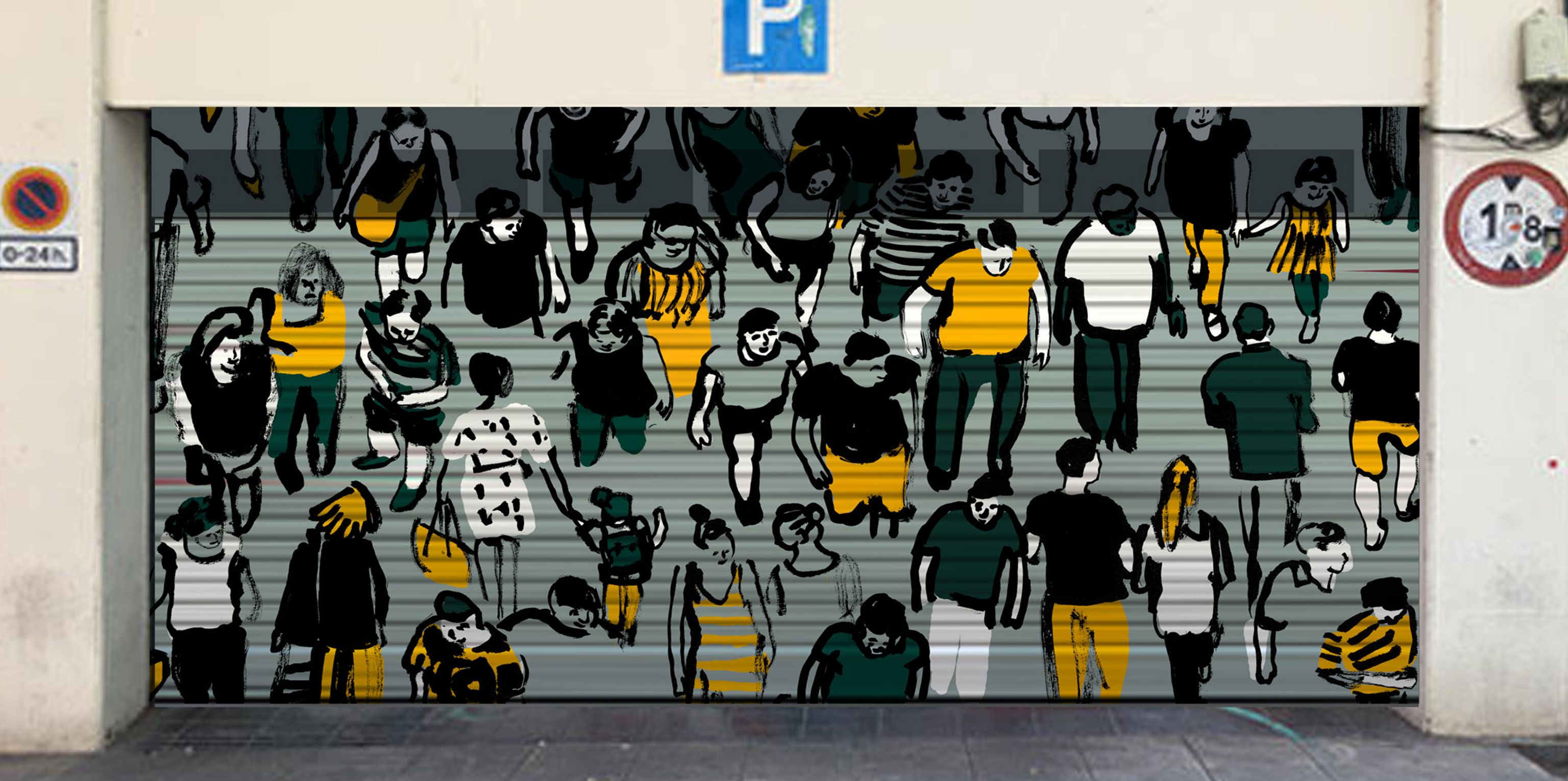 Mi idea era reflejar una zona tan transitada y de paso como la plaza Bonsuccés. Por eso aposté por dibujar gente. Me gustaba representarlos como si la persiana fuese un espejo que reflejase lo que sucede en la calle. Como el espejo del Maremàgnum.