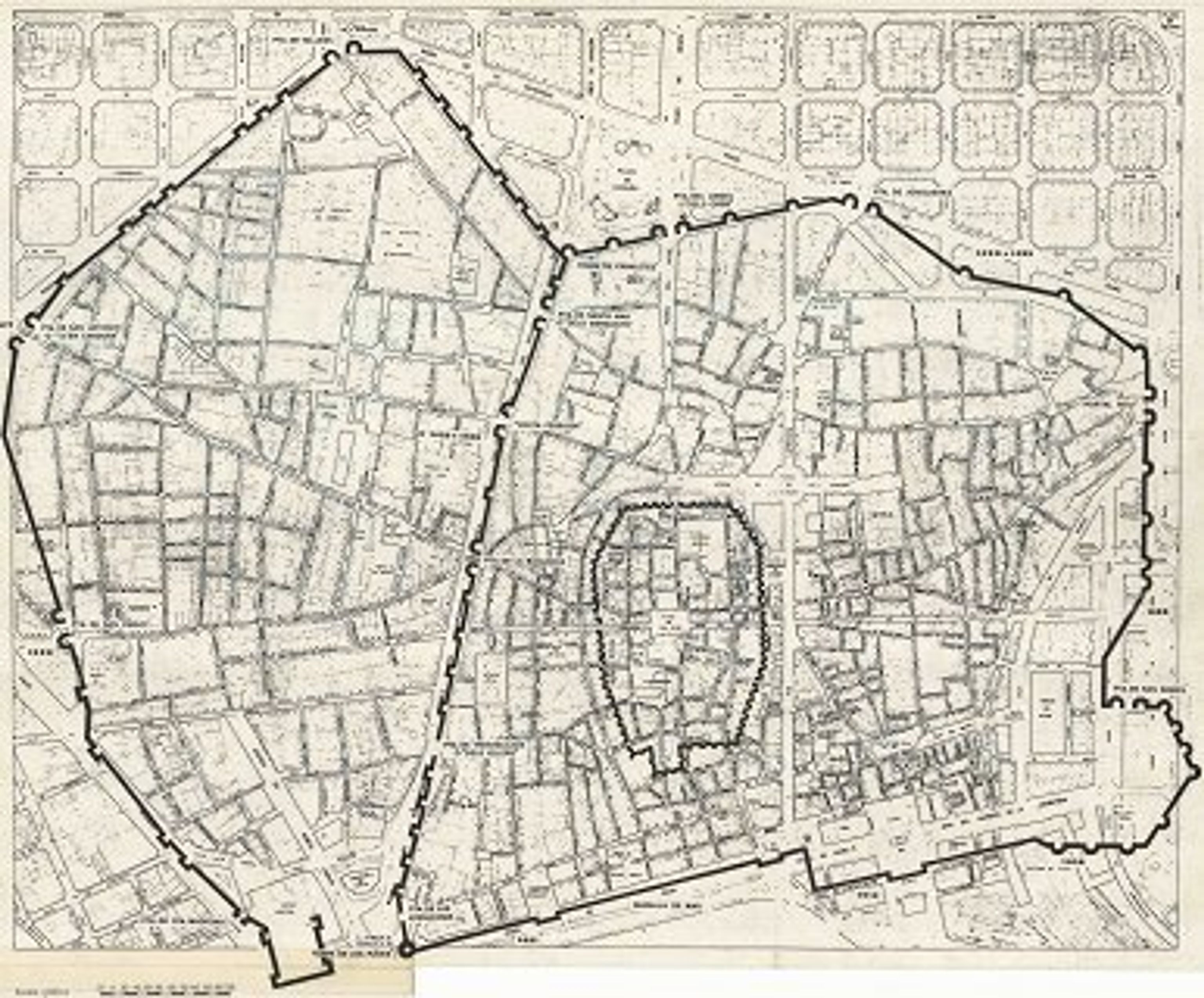 Plano de la Barcelona actual, con el perímetro amurallado correspondiente al siglo xv superpuesto. (Wikipedia)
